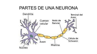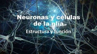 Este documento describe las diferentes partes y tipos de neuronas y células gliales en el sistema nervioso. Detalla las neuronas motoras, de proyección e interneuronas que transmiten señales dentro del sistema nervioso central, y las neuronas sensoriales que reciben información. También describe las células gliales neuroglia y células de Schwann, y sus funciones como astrocitos, microglia, células ependimarias y oligodendrocitos en el soporte y aislamiento de las neuronas.