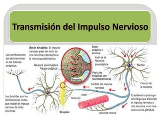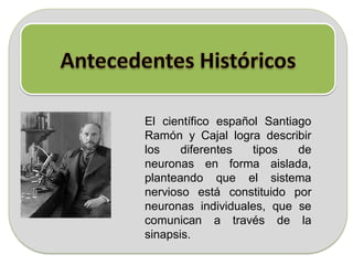 El documento describe las neuronas, incluyendo su estructura, tipos y funciones. Explica que Santiago Ramón y Cajal descubrió que el sistema nervioso está compuesto de neuronas individuales que se comunican a través de sinapsis. También describe los neurotransmisores y cómo se transmiten las señales entre neuronas.