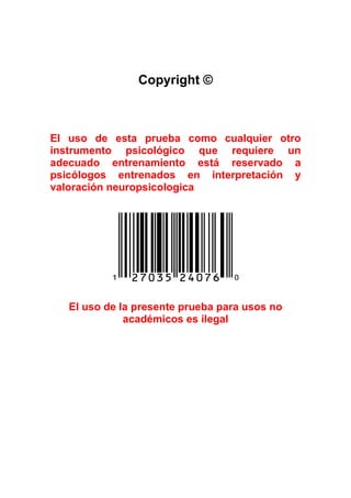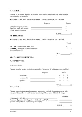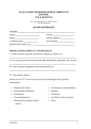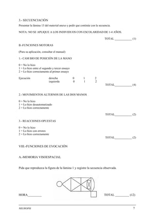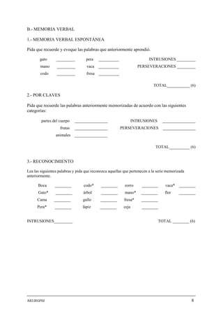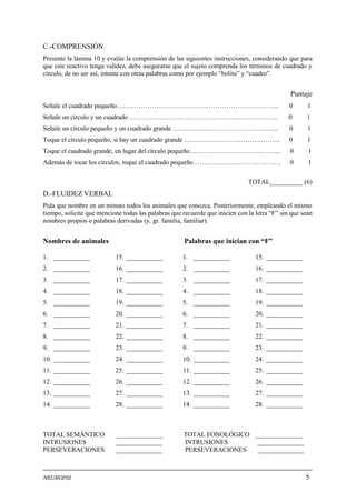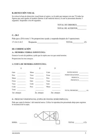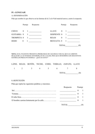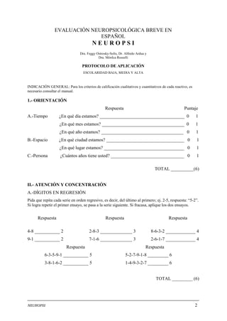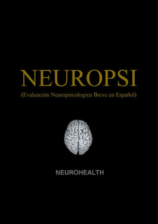 Este documento presenta la Evaluación Neuropsicológica Breve en Español (NEUROPSI), una herramienta de evaluación cognitiva breve. Describe los materiales necesarios para aplicar la prueba, incluyendo laminas con estímulos y hojas de registro. Explica que la NEUROPSI evalúa funciones como atención, memoria, lenguaje y habilidades visoespaciales. Finalmente, indica que esta herramienta es útil para realizar diagnósticos y planificar intervenciones cognitivas en pacientes con alteraciones del