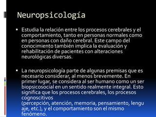 La neuropsicología estudia la relación entre los procesos cerebrales y el comportamiento en personas normales y con daño cerebral. Implica la evaluación y rehabilitación de pacientes con alteraciones neurológicas. Se considera al ser humano como un ser biopsicosocial integral donde los procesos cerebrales, cognitivos y el comportamiento son el mismo fenómeno. El cerebro cambia dependiendo de la experiencia a través de la plasticidad. La evaluación neuropsicológica analiza las áreas cerebrales afectadas y sus repercusiones.