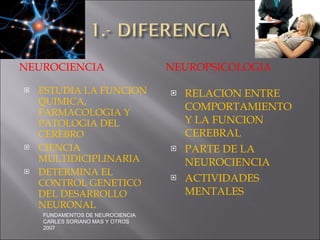 La neuropsicología estudia la función química, farmacología y patología del cerebro para determinar el control genético del desarrollo neuronal y la relación entre el comportamiento y la función cerebral. Permite identificar con precisión las lesiones cerebrales y desarrollar terapias, además de proveer herramientas para analizar y resolver problemas de comportamiento.