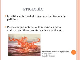 La neurosífilis es causada por la infección del sistema nervioso central por el Treponema pallidum, la bacteria que causa la sífilis. Puede presentarse de forma congénita en niños menores de 2 años cuyas madres tenían sífilis no tratada durante el embarazo, o de forma adquirida en adultos, generalmente entre las décadas de 5 a 6 de la vida. Los síntomas incluyen vértigo, hipoacusia, tinnitus y otros síntomas neurológicos. El diagnóstico se realiza mediante prue