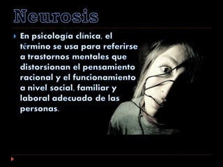 Los episodios neuróticos son más comunes entre los 25 y 45 años, aumentando hasta los 60, con una mayor susceptibilidad en mujeres a las neurosis histéricas y depresivas. El diagnóstico depende de un examen mental y pruebas psicológicas, como el test de Rorschach, que evalúa la personalidad y ayuda a diferenciar entre neurosis y psicosis. El tratamiento incluye abordajes farmacológicos y psicoterapéuticos, buscando restaurar la adaptación del paciente y mejorar su autoestima.