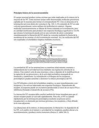 El documento describe los principales neurotransmisores en el sistema nervioso, incluyendo su síntesis, almacenamiento, liberación y degradación. Menciona que los principales neurotransmisores excitatorios son el glutamato y el aspartato, mientras que el principal neurotransmisor inhibitorio es el ácido gamma-aminobutírico. También describe otros importantes neurotransmisores como la acetilcolina, la serotonina, la dopamina, la noradrenalina, las encefalinas y las endorfinas, así como sus funciones y mecanismos de
