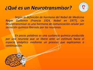 Este documento describe los neurotransmisores, que son sustancias químicas liberadas por las neuronas para comunicarse entre sí. Explica que existen dos tipos de receptores, inotrópicos y metabotrópicos, y describe el proceso de neurotransmisión. Además, detalla varios neurotransmisores importantes como la acetilcolina, dopamina, serotonina, GABA y glutamato, y sus funciones en el sistema nervioso central.