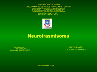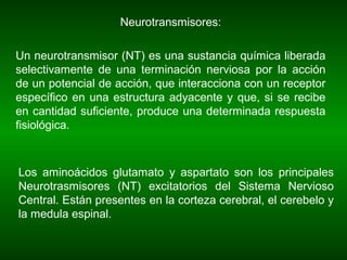 Los neurotransmisores son sustancias químicas que se liberan de las neuronas y transmiten señales entre ellas. Los principales neurotransmisores excitatorios son el glutamato y aspartato, mientras que el principal inhibidor es el ácido g-aminobutírico. Otros importantes neurotransmisores incluyen la acetilcolina, dopamina, serotonina y norepinefrina. Los neurotransmisores se almacenan en vesículas y se transportan a través de la sinapsis, donde interactúan con receptores específicos y producen
