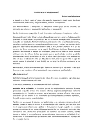 Este documento presenta una conferencia de Neus Sanmartí sobre la evaluación en la escuela. En 3 oraciones:
