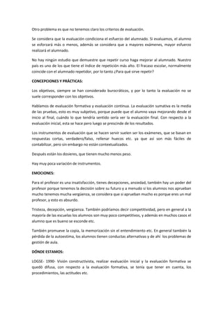 1) Explica que tradicionalmente la evaluación se ha utilizado para identificar el fracaso en lugar de los éxitos y promover la mejora, y que debería usarse para ayudar a los estudiantes a superar las dificultades.
