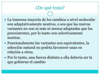 La teoría de la evolución molecular neutralista sostiene que la mayoría de los cambios moleculares son neutrales desde el punto de vista de la adaptación y ocurren por deriva genética. Las mutaciones neutras se propagan en la población de forma aleatoria y su frecuencia cambia con el tiempo debido al tamaño finito de las poblaciones. El número de mutaciones neutrales acumuladas entre especies puede usarse como un reloj molecular para estimar los tiempos de divergencia entre linajes evolutivos.