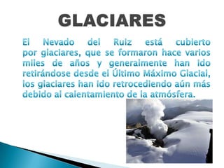 El volcán Nevado del Ruiz se encuentra en Colombia en la frontera entre los departamentos de Caldas y Tolima. Es un estratovolcán compuesto de capas alternas de lava y ceniza volcánica. Sus erupciones generalmente son de tipo pliniano que generan flujos piroclásticos y lahares, los cuales representan un peligro para las poblaciones cercanas. La erupción de 1985 desencadenó un lahar que enterró la ciudad de Armero, causando una gran tragedia. A pesar de la reducción del tamaño de los