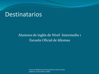Este documento presenta un plan de lecciones para estudiantes de inglés intermedio que utiliza medios de comunicación como recurso didáctico. El curso se centra en la práctica de expresiones y tiempos verbales para expresar deseos en el futuro a través de una serie de televisión estadounidense. Las lecciones incluyen actividades como completar tablas y hojas de trabajo mientras ven el video, investigar celebraciones de Año Nuevo en países de habla inglesa, y organizar un role-play de una fiesta de Año Nue