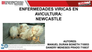 La enfermedad de Newcastle es una infección viral altamente contagiosa que afecta a las aves de corral y es causada por el virus paramyxovirus aviar tipo 1. Puede causar altas tasas de mortalidad en pollos y se transmite principalmente por contacto directo. No existe tratamiento, pero se controla mediante vacunación y bioseguridad en las granjas avícolas.
