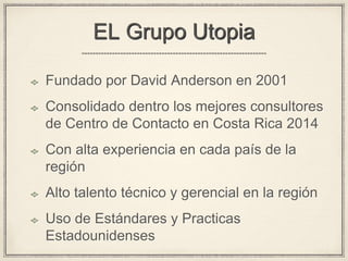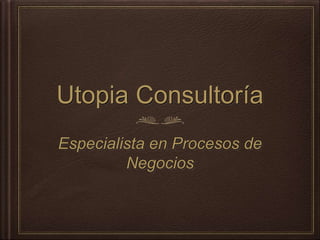 Utopia Consultoría es una empresa de consultoría fundada en 2001 por David Anderson y especializada en procesos de negocios y centros de contacto. Cuenta con experiencia en toda América Latina y provee servicios como el diseño de operaciones eficientes, la implementación de nuevas organizaciones, y mejoras para organizaciones existentes. Su equipo de consultores tiene amplia experiencia en la industria y ofrece flexibilidad y soluciones a bajo costo para sus clientes.