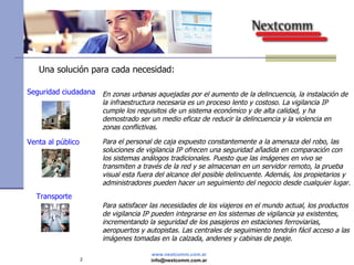 Este documento describe las ventajas y usos de los sistemas de video vigilancia IP (protocolo de internet) en diferentes entornos como zonas urbanas, comercios, transporte, banca, industria y educación. Explica que las soluciones de video IP ofrecen seguridad a distancia a través de la red y son más económicas que los sistemas analógicos tradicionales. También resume diferentes tipos de soluciones de video IP como soluciones inalámbricas, híbridas, plataformas NVR y el monitoreo