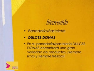 Este documento presenta la panadería Dulces Donas, la cual ofrece una variedad de donas rellenas de arequipe y cubiertas con azúcar, así como otros sabores. La panadería elabora donas diariamente en diferentes formas, colores y sabores, y ofrece servicio a domicilio las 24 horas.