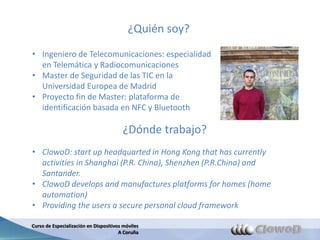 El documento es una presentación sobre la tecnología NFC (Comunicación de Campo Cercano), que aborda su historia, arquitectura y aplicaciones. El autor, Jesús González Tejería, un ingeniero experto en telecomunicaciones, explora la necesidad de esta tecnología en comparación con otras como RFID y Bluetooth. Se discuten sus ventajas, modos de comunicación y aspectos de seguridad, resaltando su importancia creciente en la automatización del hogar y la interacción diaria del usuario.