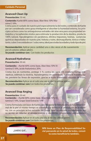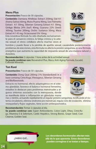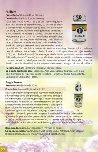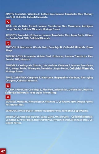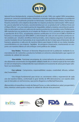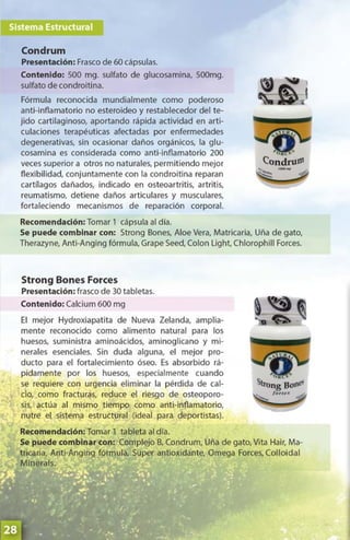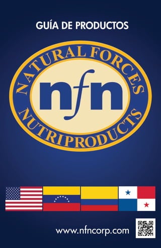 Este documento presenta una guía de productos de la compañía Natural Forces Nutriproducts. Incluye descripciones de varios suplementos nutricionales y fitofármacos, sus ingredientes activos y beneficios. También proporciona información de contacto de varios centros de distribución en Venezuela.