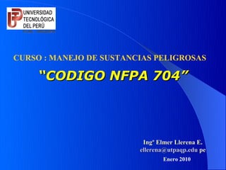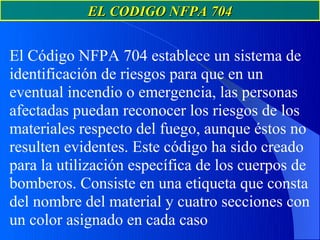 El documento describe el Código NFPA 704, un sistema de identificación de riesgos que consiste en una etiqueta con cuatro secciones de colores que indican el riesgo de inflamabilidad, riesgos para la salud, riesgos de reactividad y otros de un material. Explica cada sección del código y cómo se gradúa el nivel de riesgo de 0 a 4 para cada categoría. El código ayuda a identificar los riesgos de materiales peligrosos para personal de emergencias.