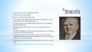 El documento proporciona información biográfica sobre el escritor ecuatoriano Ángel Felicísimo Rojas. Nació en 1909 en Loja, Ecuador y dedicó gran parte de su vida a la literatura y la política. Algunas de sus obras más destacadas incluyen la novela El éxodo de Yangana de 1949, que narra un conflicto de tierras en una población rural explotada. Rojas falleció en 2003 en Guayaquil.