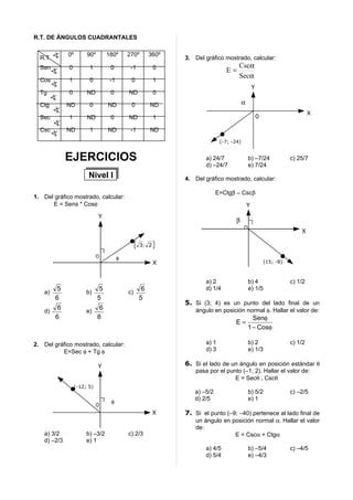 Este documento presenta conceptos básicos sobre ángulos trigonométricos en posición normal. Explica que un ángulo está en posición normal si su vértice está en el origen y su lado inicial coincide con el eje X positivo. Define las razones trigonométricas para ángulos en posición normal y explica sus signos en cada cuadrante. También introduce ángulos cuadrantales y presenta ejercicios de práctica para aplicar los conceptos.