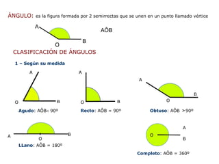 Este documento describe los diferentes tipos de ángulos. Define un ángulo como la figura formada por dos semirrectas que se unen en un punto llamado vértice. Explica que los ángulos pueden ser agudos, obtusos, rectos, llanos o completos dependiendo de su medida. También clasifica los ángulos como consecutivos, adyacentes u opuestos por el vértice según su posición, y como complementarios o suplementarios según sus características.