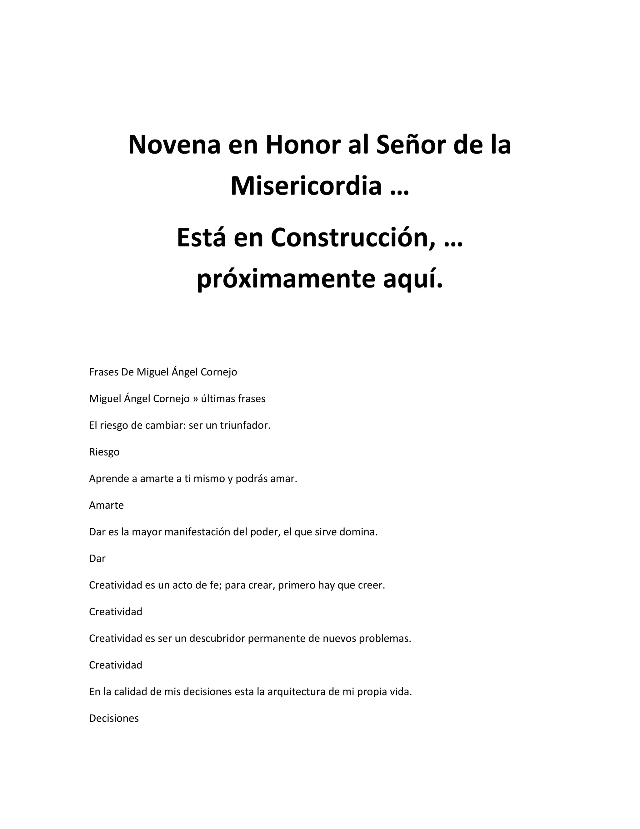 La novena en honor al Señor de la Misericordia consiste en una serie de oraciones que piden la misericordia divina para diferentes grupos, incluyendo la humanidad, el clero, los fieles, los paganos, los herejes, los niños, y las almas del purgatorio. Cada día de la novena incluye invocaciones específicas y súplicas para garantizar la atención divina y la restauración espiritual. El documento también incluye la recitación de la Corona de la Misericordia y la Letanía de la Misericordia, enfatizando la importancia de la fe y la esperanza en la gracia de Dios.