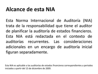 La norma establece los requisitos para la planificación de la auditoría de estados financieros. La planificación incluye desarrollar una estrategia global de auditoría y un plan de auditoría más detallado. La planificación requiere la participación del equipo de auditoría y actividades preliminares como evaluar la independencia. El plan de auditoría describe los procedimientos para evaluar riesgos y pruebas de detalle. La documentación debe incluir la estrategia, plan y cambios significativos realizados.