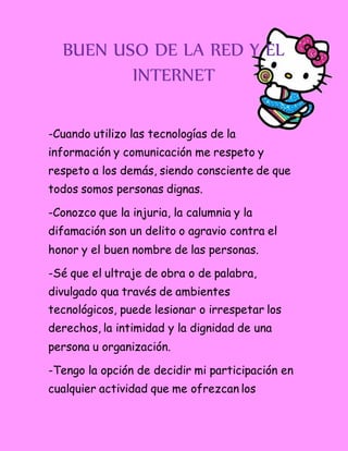 El documento ofrece lineamientos para un buen uso de la red e internet, respetando la dignidad y derechos de los demás. Recomienda no participar en actividades dañinas, proteger la información personal y no usar identidades falsas. Además, enfatiza la importancia de respetar la privacidad ajena y expresarse de manera libre pero responsable en entornos tecnológicos.