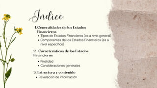 Este documento describe los diferentes tipos de estados financieros, sus componentes y requisitos de presentación de acuerdo con las Normas Internacionales de Información Financiera (NIIF). Brevemente, explica que los estados financieros separados son de cada entidad por separado, mientras que los consolidados agregan la información de subsidiarias. También cubre los estados financieros intermedios, los componentes principales como el balance general y estado de resultados, y requisitos como el periodo de reporte y revelación de políticas contables.