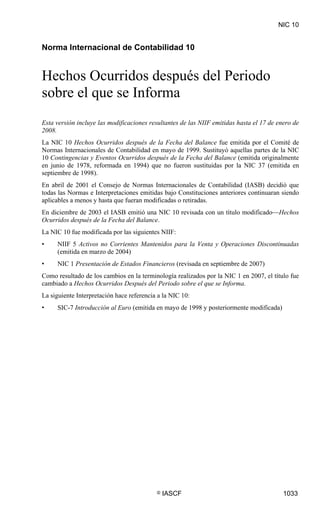 Este documento presenta la Norma Internacional de Contabilidad 10 (NIC 10) sobre hechos ocurridos después del periodo sobre el que se informa. La NIC 10 especifica cuándo una entidad debe ajustar sus estados financieros por tales hechos y la información a revelar. La norma requiere ajustes por hechos que proporcionan evidencia de condiciones existentes al final del periodo, pero no por hechos que indican condiciones posteriores. La norma también prohíbe preparar estados financieros bajo la hipótesis