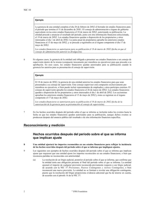 Este documento establece las normas para el tratamiento contable de los hechos ocurridos después del periodo sobre el que se informa. Define qué son estos hechos y distingue entre aquellos que implican ajuste y los que no. Exige que se ajusten los importes reconocidos en los estados financieros para reflejar los hechos que impliquen ajuste y que se revele información sobre los hechos materiales que no impliquen ajuste. También requiere revelar la fecha de autorización de los estados financieros y actualizar