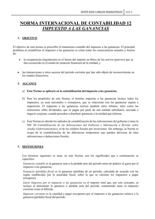Esta norma establece los principios para la contabilización del impuesto a las ganancias. Requiere el reconocimiento de pasivos y activos por impuestos corrientes y diferidos, y especifica cómo deben medirse y compensarse. También exige la revelación por separado de los componentes principales del gasto o ingreso por impuestos en los estados financieros.