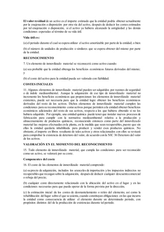 La Norma Internacional de Contabilidad No 16 establece las directrices para el tratamiento contable del inmovilizado material. Prescribe que los activos materiales deben reconocerse como activos cuando sea probable que generen beneficios económicos futuros y su costo pueda medirse con fiabilidad. Además, especifica cómo medir el costo inicial y posterior de los activos, incluida la opción de revalorización, y establece directrices sobre amortización y deterioro.