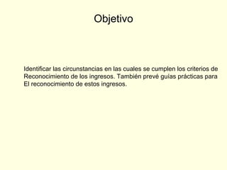 Este documento define los criterios para el reconocimiento de ingresos según la NIC 18. Explica que los ingresos se reconocen cuando se cumplen ciertas condiciones como la transferencia de riesgos y beneficios a los clientes. También cubre el reconocimiento de ingresos por venta de productos, prestación de servicios y uso de activos. Finalmente, incluye algunas resoluciones del tribunal fiscal relacionadas con el tema.