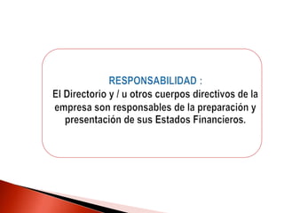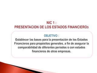 Este documento presenta una introducción a la NIC 1 sobre la presentación de estados financieros. Explica que la NIC 1 establece criterios contables para la presentación de estados financieros, incluyendo requisitos sobre la estructura, contenido y revelaciones. También cubre conceptos clave como políticas contables, importancia relativa, comparabilidad, devengado y empresa en marcha. El objetivo es establecer bases para la presentación confiable y útil de estados financieros para propósitos generales.