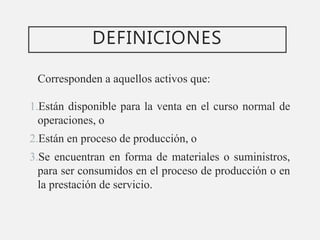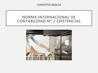 Este documento presenta un resumen de la Norma Internacional de Contabilidad No. 2 sobre existencias. Define existencias como activos mantenidos para la venta, producción o consumo. Establece que las existencias deben valorizarse al costo o al valor neto de realización, el menor de los dos. Además, explica cómo calcular el costo de las existencias incluyendo costos de compra, transformación e indirectos, así como técnicas como el costeo promedio para su medición.