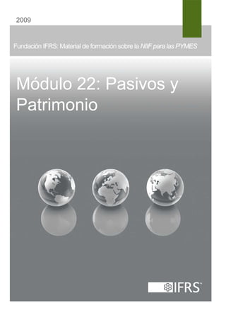 Este documento presenta el material de formación sobre la Sección 22: Pasivos y Patrimonio de la Norma Internacional de Información Financiera para las Pequeñas y Medianas Entidades (NIIF para las PYMES). Incluye el texto completo de la Sección 22 publicado por el Consejo de Normas Internacionales de Contabilidad en 2009, con explicaciones, preguntas de evaluación y casos prácticos. El objetivo es asistir a los formadores en la implementación y aplicación consistente de los requerimientos de la NIIF para las PYMES.