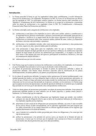 La NIC 19 establece las directrices para el tratamiento contable de las retribuciones a los empleados, incluyendo prestaciones a corto y largo plazo. Define planes de aportaciones definidas y prestaciones definidas, requiriendo el reconocimiento de costos y obligaciones de diferentes maneras. También cubre indemnizaciones por cese, requiriendo que se reconozcan cuando ocurre la conclusión del contrato laboral.