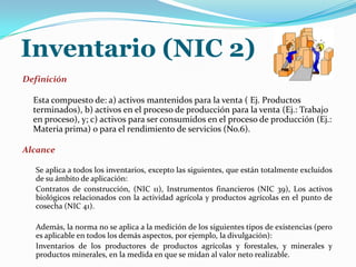 Este documento resume la norma internacional de contabilidad NIC 2 sobre inventarios. Define inventarios como activos mantenidos para la venta, en proceso de producción o para ser consumidos, y establece que deben medirse al menor valor entre el costo y el valor neto realizable. Explica los métodos de medición de costo promedio ponderado y primero que entra primero que sale, y requiere divulgar la fórmula de costeo utilizada y un análisis de los inventarios.