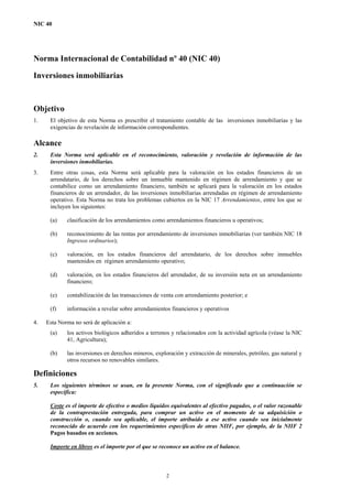La NIC 40 establece las normas de contabilidad para las inversiones inmobiliarias. Define una inversión inmobiliaria como un terreno o edificio mantenido para obtener rentas o plusvalías en lugar de para su uso en la producción o venta. Establece los requisitos de reconocimiento inicial, valoración posterior y revelación de información para las inversiones inmobiliarias.
