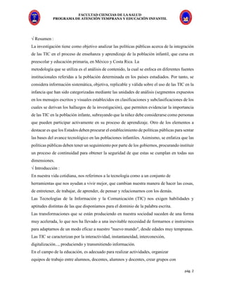 El documento analiza el uso de la tecnología en la educación infantil. Explica que las TIC pueden fortalecer la enseñanza y el aprendizaje al hacerlos más interactivos e instantáneos. También pueden desarrollar habilidades como la colaboración y la resolución de problemas. Sin embargo, su uso efectivo requiere un cambio en los roles del profesor y el alumno, así como una evolución pedagógica para aprovechar plenamente sus beneficios.