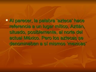 La civilización azteca se desarrolló en México central a partir del siglo XIV, estableciendo la gran ciudad de Tenochtitlán en una isla del lago de Texcoco. Los aztecas construyeron un gran imperio que dominó México central y el sur hasta su conquista por los españoles en 1521, liderados por Hernán Cortés. Aunque Moctezuma II recibió inicialmente a Cortés, los aztecas no pudieron evitar la derrota final ante los invasores españoles y sus aliados tlaxcaltecas.