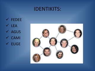 Este documento presenta una comparación de los perfiles y actividades de 5 usuarios de Facebook, identificados como Fedee, Lea, Agus, Cami y Euge. Se analizan las posiciones por adhesión a grupos, publicaciones en grupos y en perfiles, posteos de estados y aplicaciones utilizadas por cada usuario. Los resultados muestran que Cami es el usuario más activo en términos de adhesión a grupos, publicaciones y posteos, mientras que Lea es el menos activo o ausente en varias categorías. El documento concluye que a