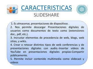 Las herramientas Slideshare y Prezi tienen semejanzas y diferencias. Ambas permiten crear y almacenar presentaciones digitales en línea e insertar contenido multimedia, pero Slideshare se basa en archivos de PowerPoint mientras que Prezi utiliza un enfoque más dinámico de zoom. Slideshare también permite seguir a otros usuarios y formar comunidades, mientras que Prezi se enfoca solo en almacenamiento de presentaciones.