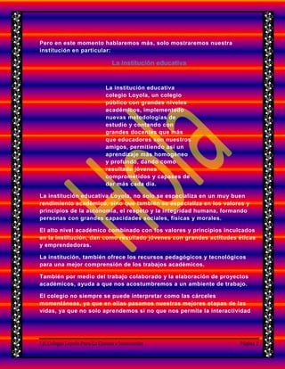 El documento describe la experiencia de los estudiantes en el colegio, incluyendo tanto aspectos negativos como positivos. Por un lado, los estudiantes a veces sienten que los profesores son estrictos y les asignan tareas inesperadas. Sin embargo, el colegio también les brinda momentos felices para socializar con sus compañeros y les ayuda a desarrollar valores. El documento también resalta los logros académicos y el énfasis en la innovación del Colegio Loyola.