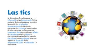 El documento habla sobre las Tecnologías de la Información y Comunicación (TIC). Explica que las TIC permiten adquirir, producir, almacenar, procesar, comunicar, registrar e presentar información. También menciona algunas ventajas de las TIC como beneficios en salud y educación y el empoderamiento de personas a través de redes. Finalmente, discute el impacto de las TIC en la educación, sociedad e implicaciones en la organización social.