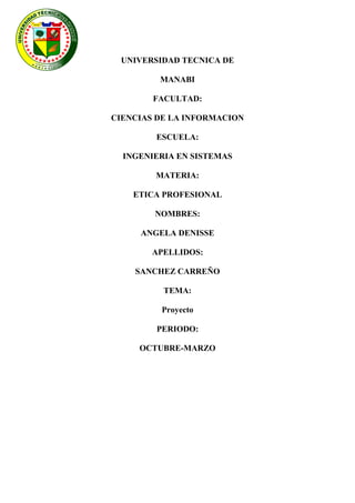Este documento describe un proyecto que tiene como objetivo enseñar a los estudiantes de informática de la Universidad Técnica de Manabi sobre sus derechos, debido a que actualmente no conocen todos los derechos que poseen. El proyecto diagnosticó que la falta de conocimiento sobre los derechos es el principal problema entre los estudiantes. El proyecto busca reconocer los derechos de la ciudadanía e intercambiar conocimientos teóricos y prácticos sobre los derechos a través de técnicas de aprendizaje como videos y