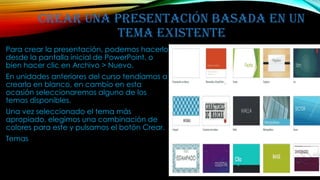 CREAR UNA PRESENTACIÓNBASADA EN UN TEMA EXISTENTE Para crear la presentación, podemos hacerlo desde la pantalla inicial de PowerPoint, o bien hacer clic en Archivo > Nuevo. En unidades anteriores del curso tendíamos a crearla en blanco, en cambio en esta ocasión seleccionaremos alguno de los temas disponibles. Una vez seleccionado el tema más apropiado, elegimos una combinación de colores para este y pulsamos el botón Crear. Temas