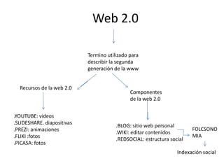 Web 2.0 es un término que describe la segunda generación de la World Wide Web, la cual se caracteriza por permitir a los usuarios interactuar y colaborar en la creación y publicación de contenido en línea. Algunos recursos populares de la Web 2.0 incluyen YouTube para videos, SlideShare para presentaciones, blogs, wikis y redes sociales.