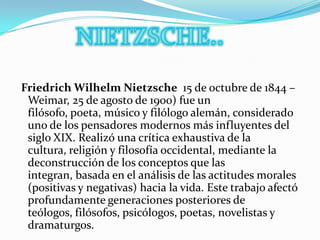 Friedrich Nietzsche fue un filósofo alemán influyente del siglo XIX que realizó una crítica de la cultura, religión y filosofía occidental mediante la deconstrucción de sus conceptos fundamentales. Vivió como autor independiente en varias ciudades europeas debido a su enfermedad. Propuso ideas como la "muerte de Dios", el "eterno retorno" y el "superhombre", siendo una de sus ideas más influyentes.